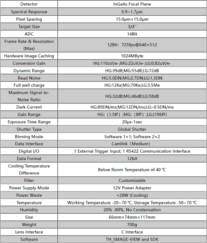 SW640-15TH adopts 330000 pixel InGaAs shortwave infrared, with a high resolution of 640 × 512 and a pixel spacing of 15 μ m. It has extremely high sensitivity in the 900nm~1700nm wavelength range. This movement has a very low dark current and high dynamic range, with a compact structure, stable performance, small size, low power consumption, and a powerful database that has strong environmental adaptability. Its powerful hardware configuration drives extremely high frame rates, which can be widely applied in fields such as spectral sorting, industrial detection, scientific research, and system integration.